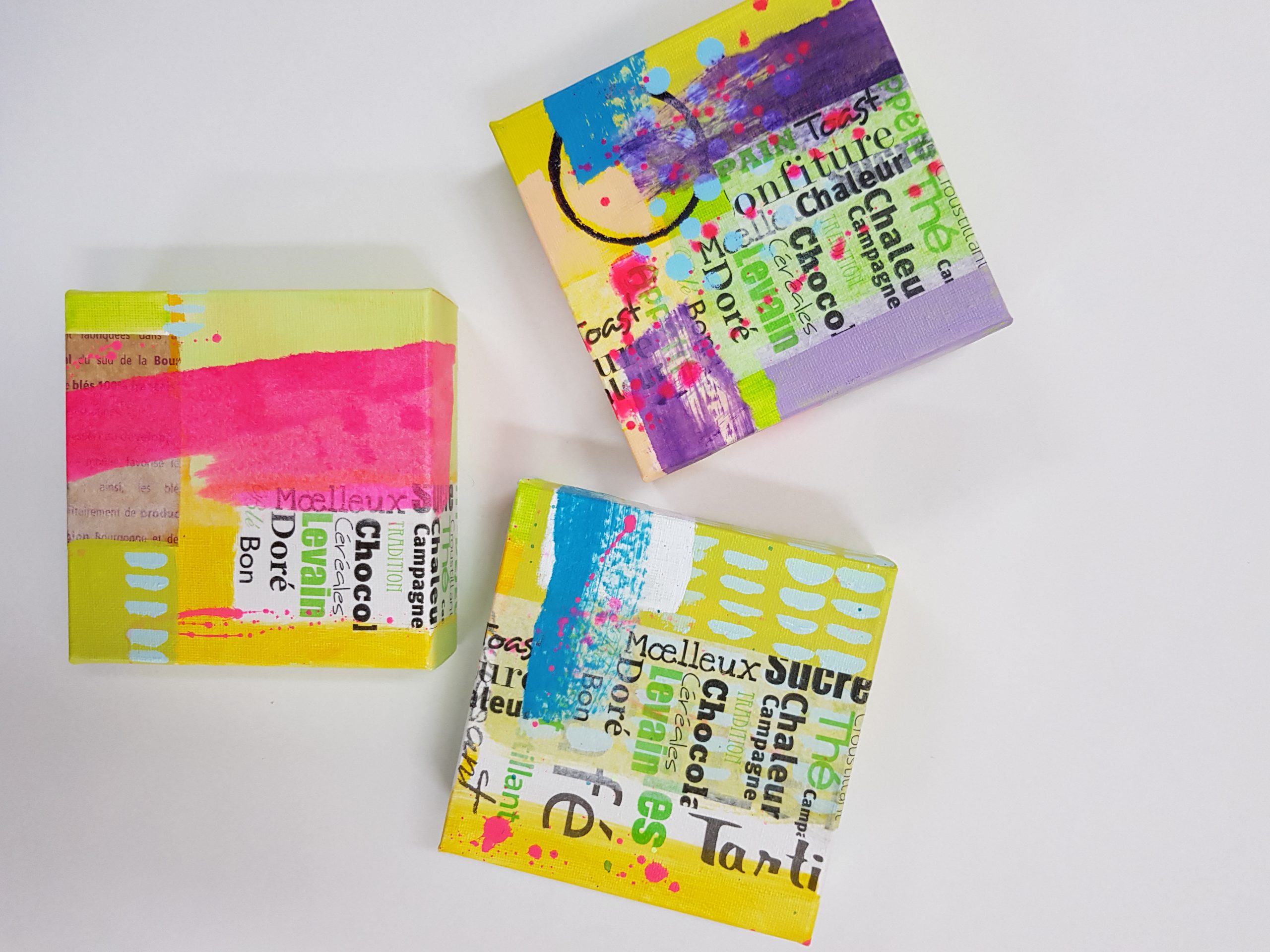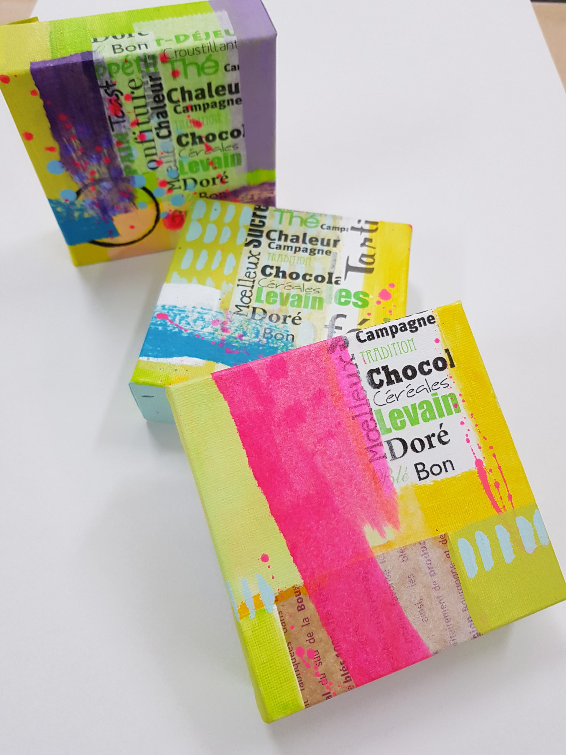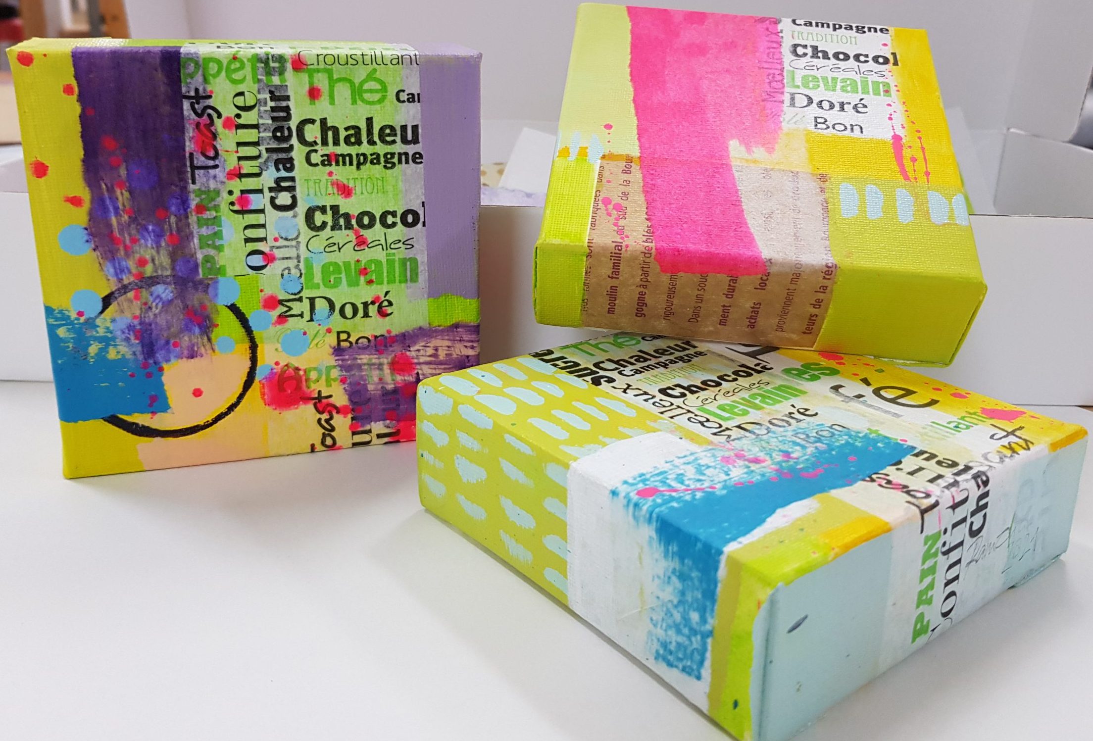 Ich zeige jeweils in 2 h Einheiten ein mögliches Bildvorgehen auf 3 kleinen Leinwänden (10 x 10 x 4 cm) zum Thema „Collage in Serie“ und wir haben die Möglichkeit über Video die TN Arbeiten zu besprechen. So kann jeder individuell seinen nächsten Schritt an den Bildern planen.