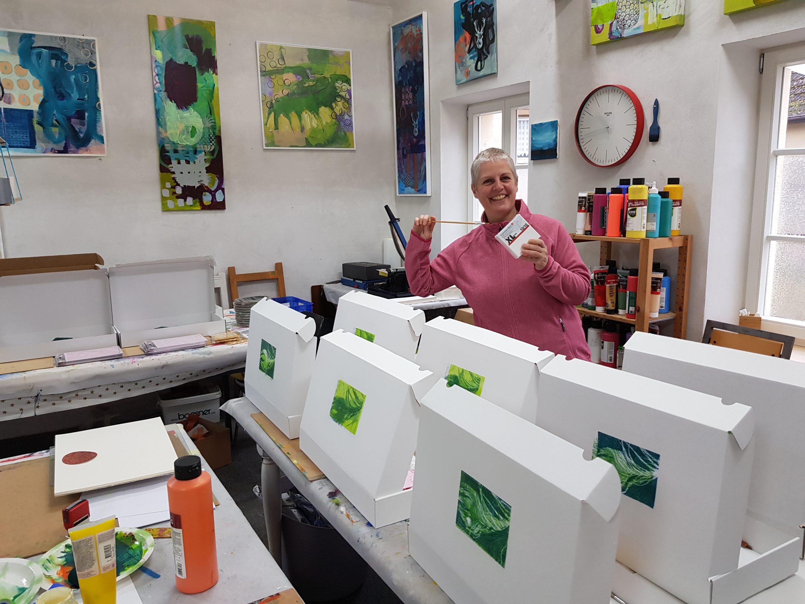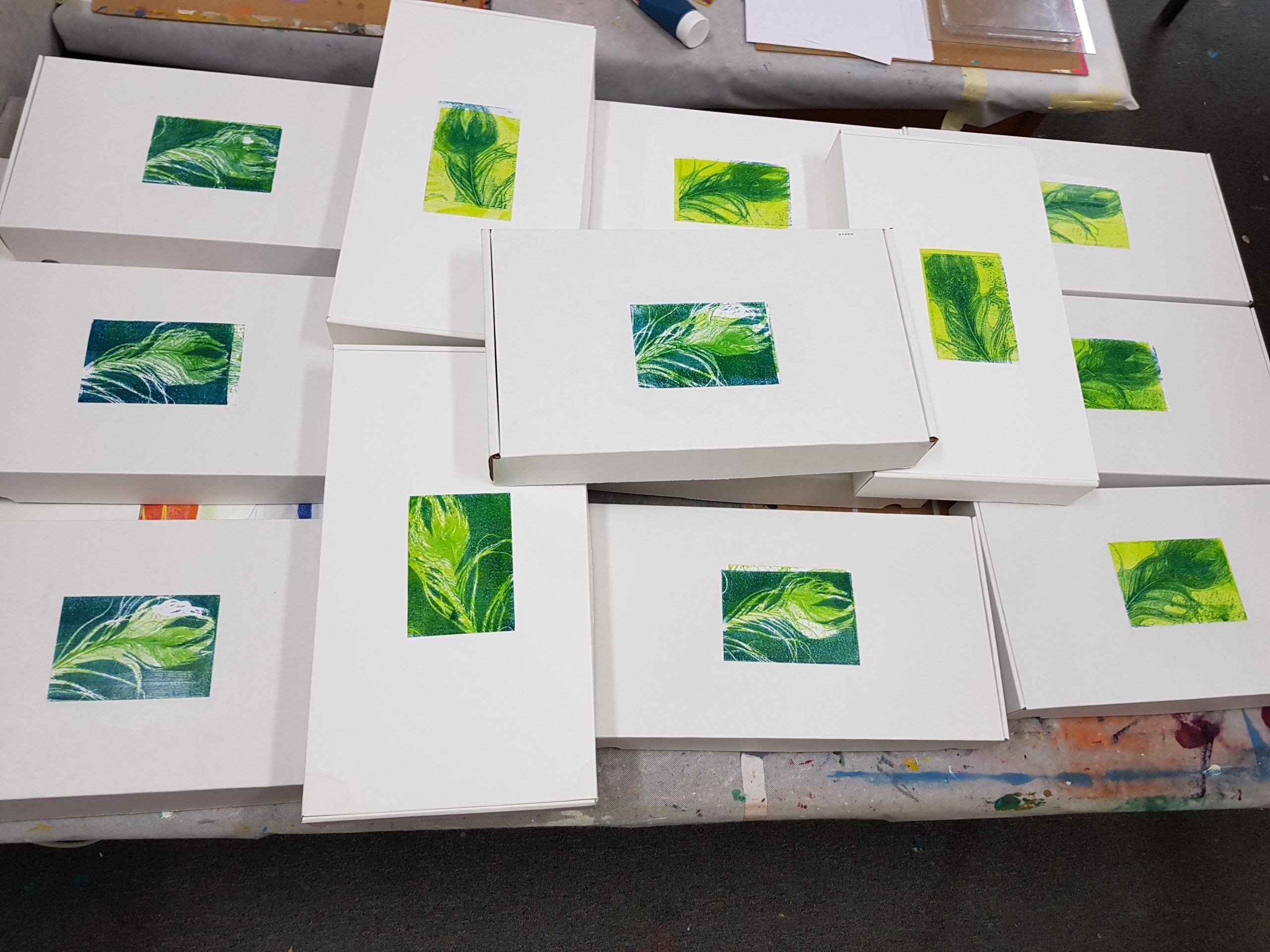 Zum Workshop bereite ich ein Materialpaket vor, welches 3 Spezial Leinwände enthält in den Maßen 10 x 10 x 4 cm. Außerdem weitere Monotypien und Siebdrucke auf Wenzhou Papier, sowie noch einige Specials im Wert von ca 35 Euro, dieses ist im Seminarpreis enthalten. Deshalb ist die Anmeldung nur bis 31. Januar 2022 möglich.