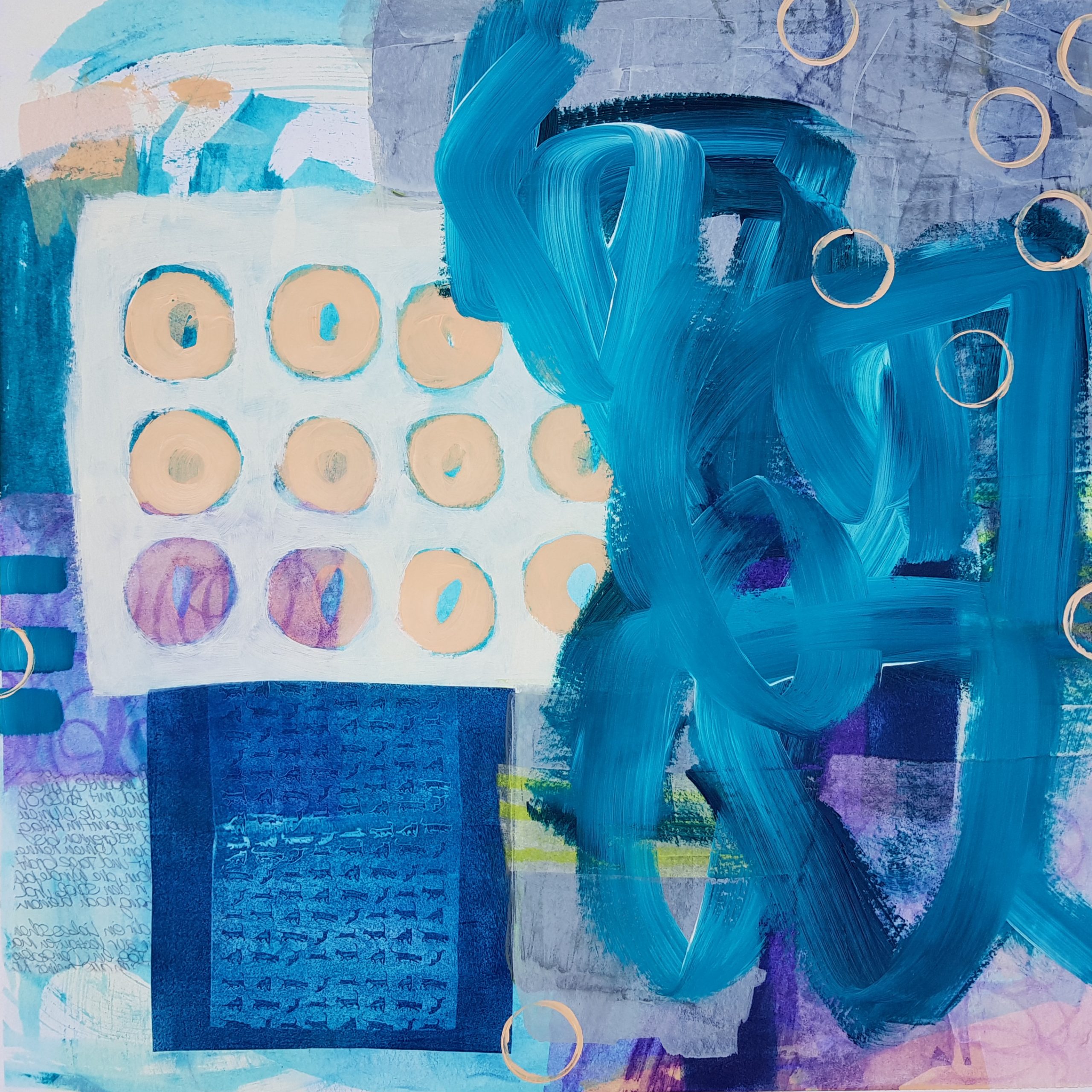 Ich zeige jeweils in 2 h Einheiten ein mögliches Bildvorgehen zum Thema „Collage mit selbstgesammeltem Papier und Wachsfarben-Resist Drucken“ und wir haben die Möglichkeit über Video auch die TN Arbeiten zu besprechen, so dass jeder individuell seinen nächsten Schritt im Bild planen kann. Die Farbgebung kann jeder ganz individuell seinen Lieblingstönen anpassen 😉